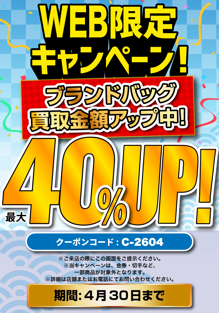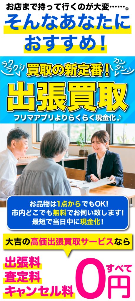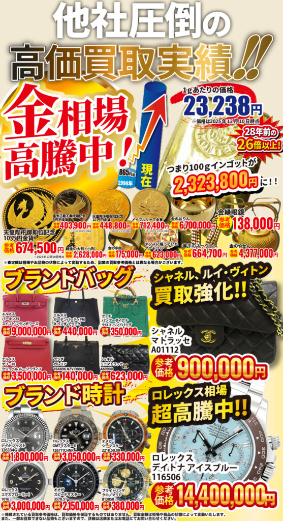 キャンペーン実施店舗 よくあるご質問 買取価格は主にどんな要素から決まるのでしょうか? お品物の状態や付属品の有無、最新相場、流通量などによって買取価格を算出します。 どんなものを買い取ってもらえますか? 金・貴金属・ブランド品はもちろん、お値段がつくか迷われているものも是非お持ちください。 傷や汚れのあるアイテムでも買取可能ですか? 大歓迎です。未使用品などのお持ち込みは少なく、傷や汚れのあるアイテムをお持ちいただく方が半数以上です。状態の悪いお品物やカビなどがあってもお買取可能なケースもございます。 どんな情報があればすぐに査定額を教えてもらえますか? お品物の名前や種類、状態、またはブランド名、型番などの情報があると、概ねの査定額をお伝えできるかと思います。 店舗での査定時間はどのくらいですか? お品物の種類や個数にもよりますが、約5分から30分ほどの査定時間となるケースが多いです。事前にある程度の査定時間をお伝えいたしますので、ご安心ください。